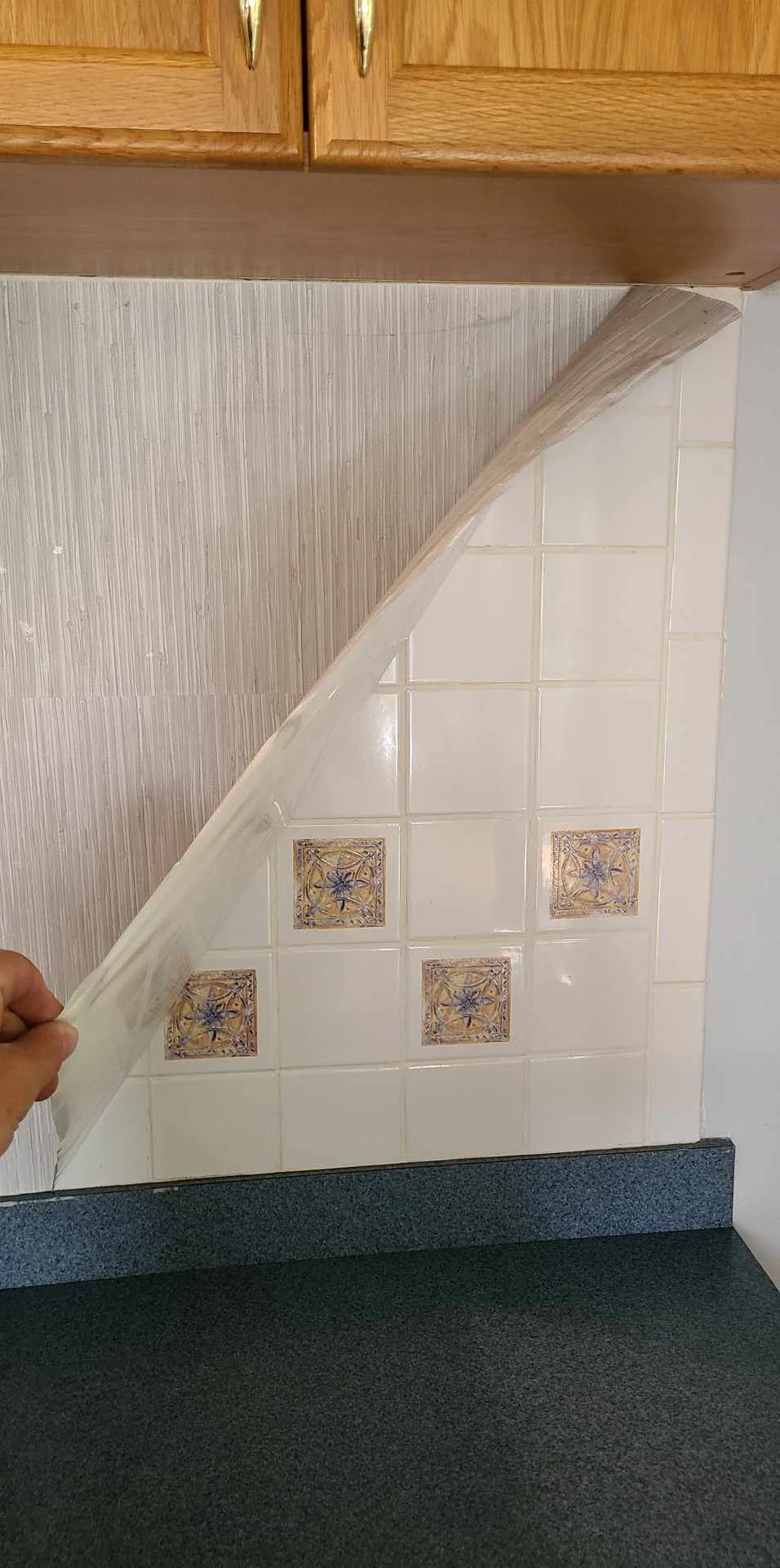 #5 resolution: THE BACKSPLASH… what a journey. What I originally assumed was wallpaper (I was right) over just walls (I was wrong) turned out to surprise us all.